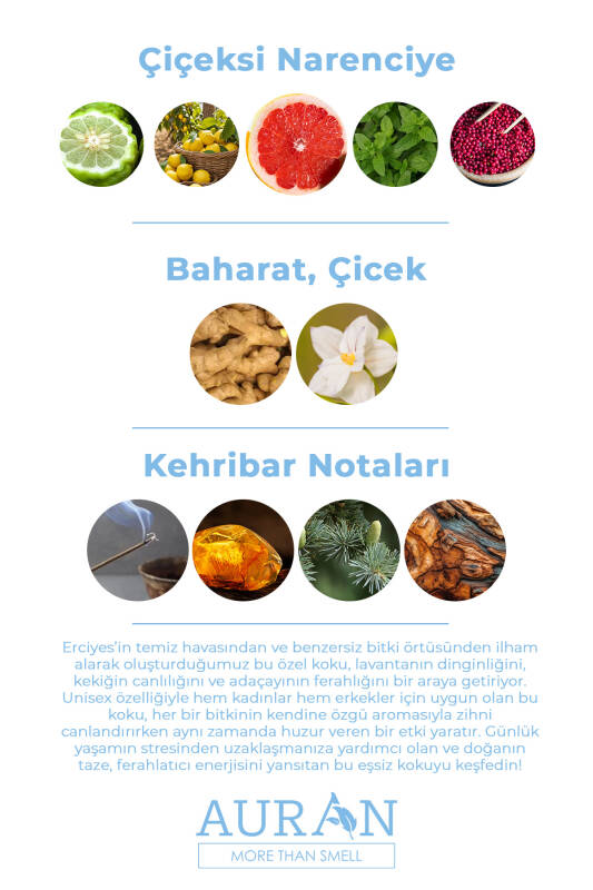 Gelince Haber VerErciyes’in temiz havası ve benzersiz bitki örtüsünden ilham alan Auran Erciyes Edp Parfüm, tazeliği ve sofistike doğallığı bir araya getiren büyüleyici bir koku deneyimi sunuyor. Üst notalarda, greyfurtun enerjik ferahlığı, limonun ışıldayan canlılığı ve nane yapraklarının serinletici etkisi, pembe biber ve lavantanın dingin notalarıyla kusursuz bir açılış yapar. Orta notalarda, zencefilin sıcak baharatlı dokunuşu ve yaseminin zarif çiçeksi tonları parfüme sofistike bir karakter kazandırır. Alt notalarda ise tütsünün meditatif derinliği, amberin sıcaklığı, sedir ağacının doğal gücü ve sandal ağacının odunsu yumuşaklığı kalıcı ve etkileyici bir iz bırakır.Üst Notalar: Greyfurt, Limon, Nane, Pembe Biber, LavantaOrta Notalar: Zencefil, YaseminDip Notalar: Tütsü, Amber, Sedir, Sandal AğacıAuran Erciyes Parfüm, unisex karakteriyle sınırları aşan bir cazibe sunarak hem kadınların hem de erkeklerin vazgeçilmezi olmaya aday. Doğanın ilham verici gücünden doğan bu eşsiz koku, taze ve ferah enerjiyi sofistike bir zarafetle birleştiriyor. Uzun süre kalıcı etkisiyle Auran Erciyes Parfüm, her an kendinizi özel hissetmenizi sağlar.