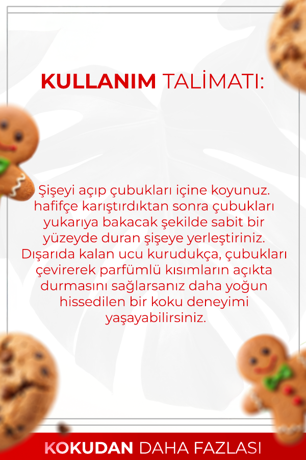 Kullanım Talimatı: Şişeyi düz bir zemine yerleştiriniz. Bambu çubukları şişeye daldırdıktan sonra ilk kullanımda birkaç saat sonra çeviriniz. Koku yoğunluğunu artırmak için çubukları haftada 1-2 kez ters çevirebilirsiniz.