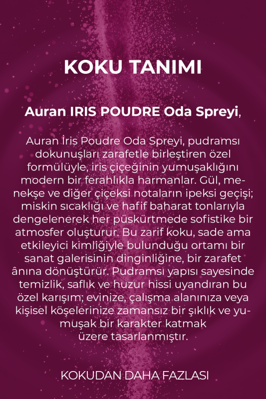 Gelince Haber Ver· Auran’ın imza dokunuşlarından biri olan Auran İris Poudre Oda ve Çamaşır Spreyi, zarafet, temizlik hissi ve çiçeksi tazeliği bir araya getirerek yaşam alanlarınızda benzersiz bir atmosfer oluşturur.· Bu özel formül, iris çiçeğinin yumuşak karakterini; gül ve menekşe gibi zarif çiçek notalarıyla ve pudrayla harmanlar. Auran İris Poudre Oda ve Çamaşır Spreyi, ortamda duyusal bir denge kurarak modern, sade ve zamansız bir şıklık sunar.· Auran İris Poudre Oda ve Çamaşır Spreyi’nin çiçeksi ve pudramsı koku profili, çamaşırlarınızda kalıcı bir temizlik ve ferahlık etkisi bırakır. Aynı zamanda evinizde zarif ve huzur verici bir atmosfer yaratır. Yastık, perde, koltuk gibi kumaş yüzeylerde güvenle kullanılabilir.· Auran İris Poudre Oda ve Çamaşır Spreyi, pudramsı yapısıyla her püskürtmede temizlik, dinginlik ve huzur hissi uyandırır.· Auran İris Poudre Oda ve Çamaşır Spreyi, yatak odası, salon, banyo, giyinme odası, çalışma alanı, çamaşırlar ve koltuklar gibi birçok alanda güvenle kullanılabilir.· Auran İris Poudre Oda ve Çamaşır Spreyi, 250 ml’lik amber pet şişede, kapaklı ve güvenli şekilde sunulmaktadır. · Auran İris Poudre Oda ve Çamaşır Spreyi, Paraben, sülfat, SLES, SLS, sentetik boya ve koruyucu içermez. Doğa dostudur, vegan kullanıma uygundur ve hayvanlar üzerinde test edilmemiştir. · Auran İris Poudre Oda ve Çamaşır Spreyi, Auran Kozmetik kalitesiyle Türkiye’de üretilmiştir.