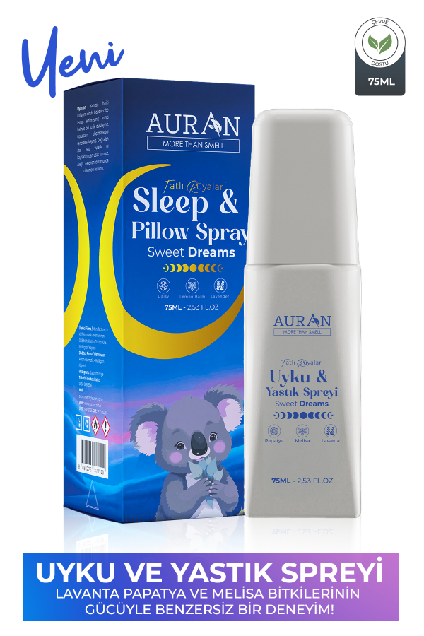 Auran Lavanta, Papatya ve Melisa Özlü Uyku ve Yastık Spreyini, yatmadan önce yastığınıza veya çarşafınıza yalnızca birkaç fıs sıkarak uygulamanız yeterlidir. Hafif, ferahlatıcı ve rahatlatıcı kokusuyla 8 saate kadar kalıcı etki sunar ve uzun süreli bir dinginlik sağlar.