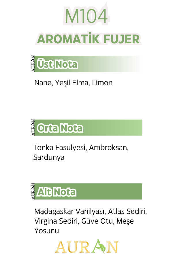 Auran erkek parfüm M104 içerisinde bulunan koku notaları şu şekildedir.