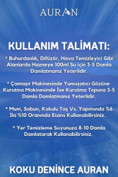 Buhurdanlık, difüzör, hava temizleyici gibi alanlarda 100ml su için 3-5 damla damlatarak kullanabilirsiniz. Çamaşır makinesinde yumuşatıcı gözüne, kurutma makinesinde ise kurutma topunuza 3-5 damla damlatarak kullanabilirsiniz. Mum yapımında %6 ila %10 oranında auran esansiyel yağ kullanabilirsiniz. Sabun yapımında %6 ila %10 oranında auran esansiyel yağ kullanabilirsiniz. Kokulu taş yapımında %6 ila %10 oranında auran esansiyel yağ kullanabilirsiniz. Parfüm yapımında %15 ila %20 oranında auran esansiyel yağ kullanabilirsiniz. Yer temizleme suyunuza 8-10 damla damlatarak kullanabilirsiniz. Ürünümüz saf'tır seyreltilmemiştir. 6 farklı boyut seçeneği mevcuttur. Koku amacıyla yapılan tüm hobi ürünlerinde kullanıma uygundur. Alkol, paraben, sülfat, sles, sls, sentetik boya ve koruyucu içermez.