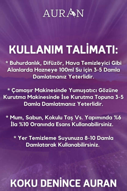 Buhurdanlık, difüzör, hava temizleyici gibi alanlarda 100ml su için 3-5 damla damlatarak kullanabilirsiniz. Çamaşır makinesinde yumuşatıcı gözüne, kurutma makinesinde ise kurutma topunuza 3-5 damla damlatarak kullanabilirsiniz. Mum yapımında %6 ila %10 oranında auran esansiyel yağ kullanabilirsiniz. Sabun yapımında %6 ila %10 oranında auran esansiyel yağ kullanabilirsiniz. Kokulu taş yapımında %6 ila %10 oranında auran esansiyel yağ kullanabilirsiniz. Parfüm yapımında %15 ila %20 oranında auran esansiyel yağ kullanabilirsiniz. Yer temizleme suyunuza 8-10 damla damlatarak kullanabilirsiniz. Ürünümüz saf'tır seyreltilmemiştir. 6 farklı boyut seçeneği mevcuttur. Koku amacıyla yapılan tüm hobi ürünlerinde kullanıma uygundur. Alkol, paraben, sülfat, sles, sls, sentetik boya ve koruyucu içermez.