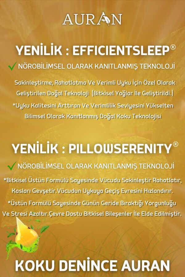 Gelince Haber VerYoğun bir günün ardından yatağa uzanıldığında, rahat bir uykuya hızla dalmak herkesin hayalidir. Auran Uyku ve Yastık Spreyleri bu hayalinizi gerçekleştirebilmek için özel olarak tasarlandı. Doğal yağların karışımları ile elde edilen eşsiz formülü sayesinde, yastığınıza veya çarşafınıza sıktığınız ilk andan itibaren, bedeninizi ve zihninizi sakinleştirir. Auran Uyku ve Yastık Spreyleri Her solukta doğanın dinginleştirici gücüne bir kez daha hayranlık duymanızı sağlar. Kumaş yüzeylerde tutunma özelliği yüksek koku molekülleri sayesinde, ortalama 8 saate kadar etkilidir, ayrıca 3 yaş ve üzeri tüm bireylerde güvenle kullanıma uygundur. Auran Uyku ve Yastık Spreyleri ile uyandığınız sabahlarda, kesintisiz ve kaliteli bir uyku deneyimi yaşadığınız için sabahları yenilenmiş bir zihin yapısı ve bedenle uyanırsınız. Bu sayede kendinizi daha dinç ve enerjik hissedersiniz. Bu his gününüzü daha dinç ve verimli geçirmenizi sağlar. Auran Uyku ve Yastık Spreyleri ile her solukta huzurun derinliklerine doğru yolcuğa çıkın.